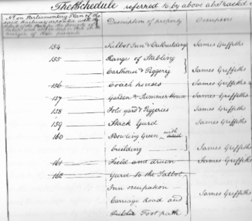 The railway company didn’t really need the Talbot Hotel and the 1851 census showed it to be in the occupancy of an ironmonger by the name of Thomas Baddeley. John Slaney’s diaries indicate that the Talbot Hotel together with other surplus land was going to auction in 1852. The sale was advertised in the local press and reveals quite a lot about Wellington and the buildings at that particular time.