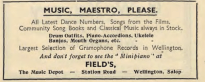 Over the years, there have been several further occupants of the bank part of the building including the Ordnance Survey Offices which in the 1980’s had an address of Midland Bank Chambers, Market Square, Wellington and a music shop in the lock up shop called Fields as can be seen from the advert from the 1930’s.
