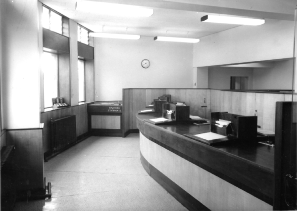 At that time, the banking hall would be on the interior of the building from the door on the white part of the building (with WH Smith beyond it) to the door going down to Station Road. The interior of the banking hall as it then looked is below.
