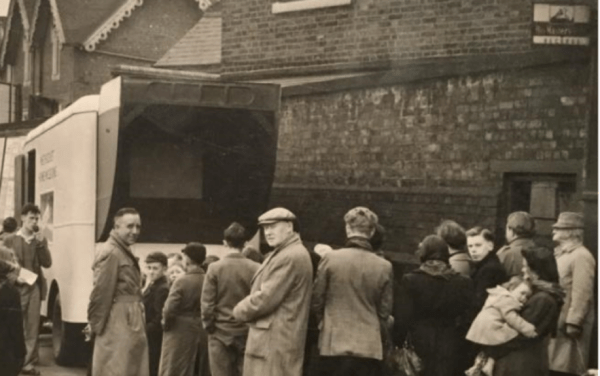 A travelling cinema was parked down Station Road at some time believed to be in the 1950’s or 1960’s. At the top right hand corner can be seen the sign for the Fields record shop and a comparison of the two photographs would show that once the record shop was closed the Midland Bank took to opportunity to improve the exterior and insert a couple of new windows.