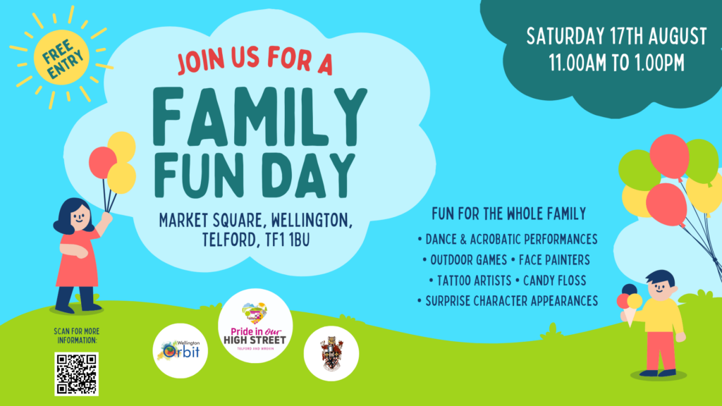 On 17th August from 11am to 1pm, Wellington Orbit, supported by Wellington Town Council and Telford & Wrekin Council will be hosting a Family Fun Day as part of the High Street celebrations. The event will feature: